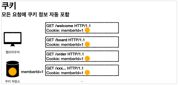 - 다른 웹 페이지 접근 시 쿠키저장소에 저장해둔 쿠키를 보내줌